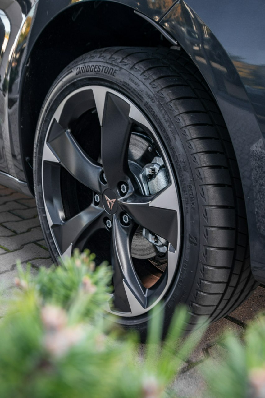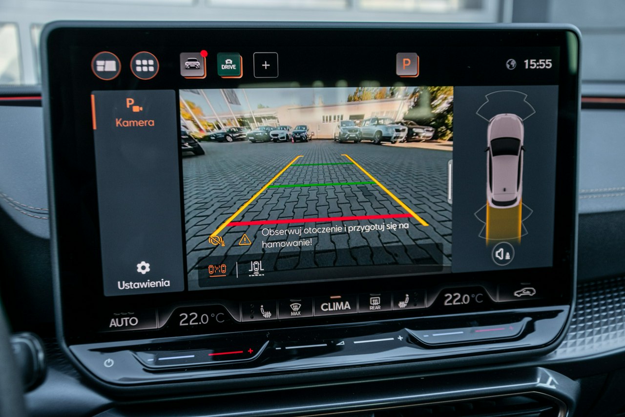 • Sportowa, podgrzewana kierownica wielofunkcyjna z łopatkami obszyta skórą z przyciskiem trybu Cupra i przyciskiem uruchamiania silnika