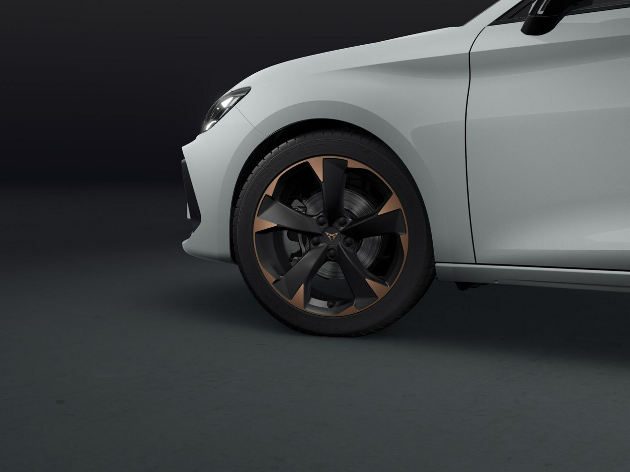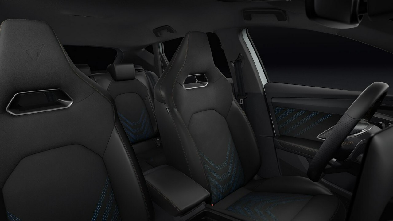 • Sportowa, podgrzewana kierownica wielofunkcyjna z łopatkami obszyta skórą z przyciskiem trybu Cupra i przyciskiem uruchamiania silnika
