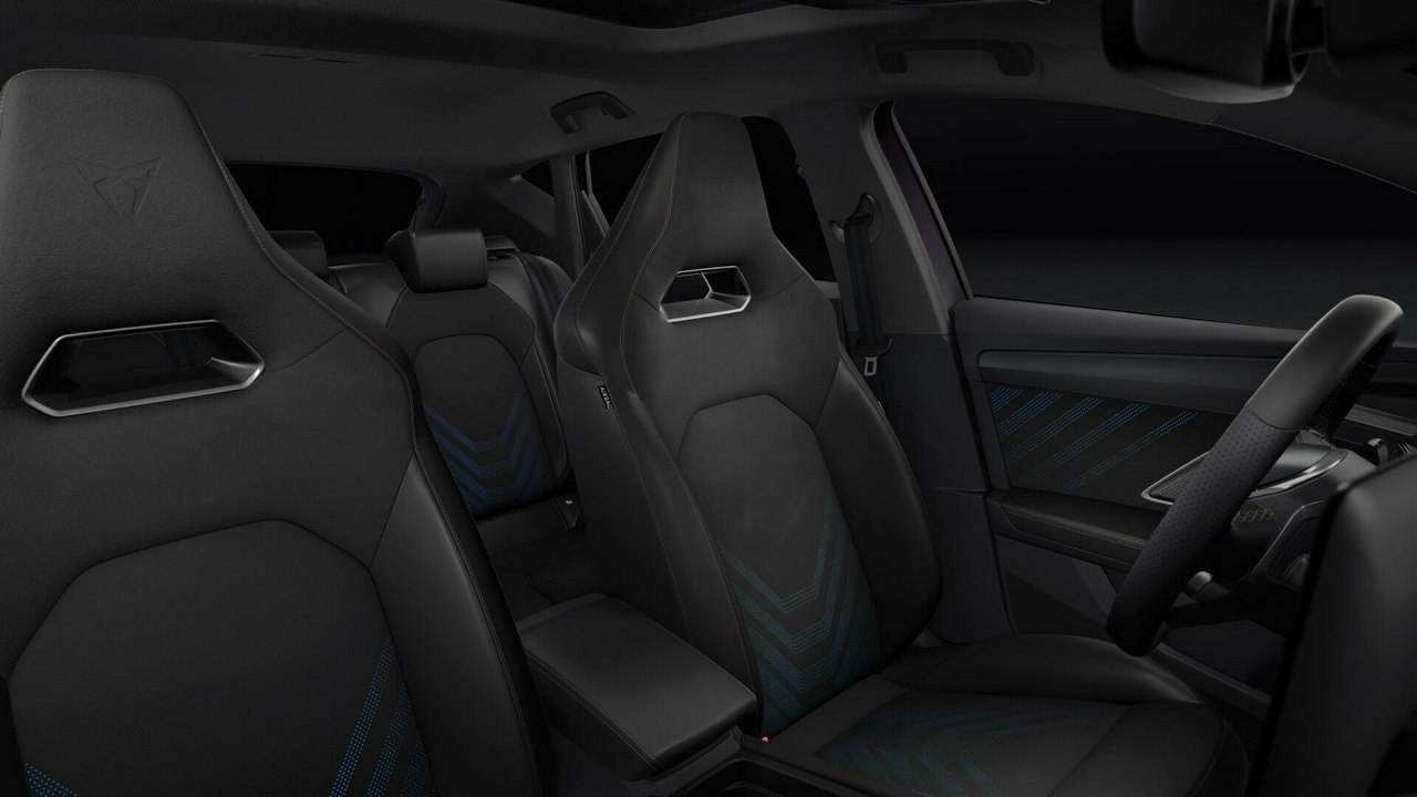 • Sportowa, podgrzewana kierownica wielofunkcyjna z łopatkami obszyta skórą z przyciskiem trybu Cupra i przyciskiem uruchamiania silnika