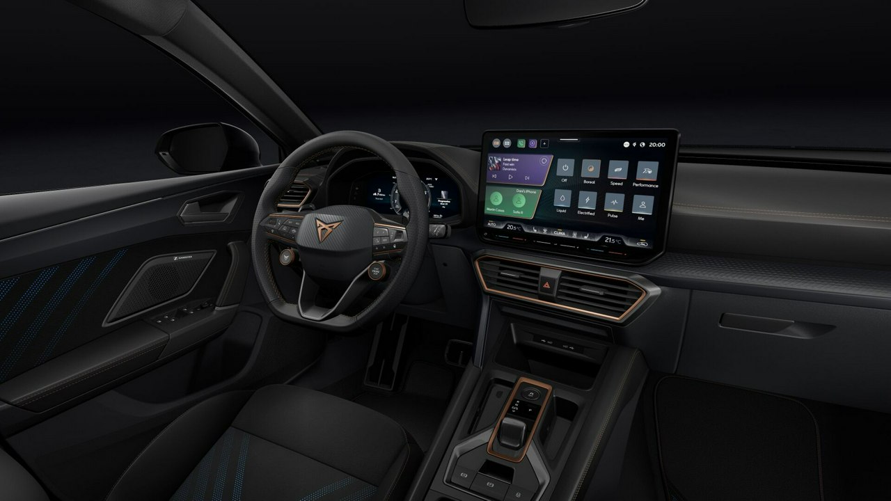 • Sportowa, podgrzewana kierownica wielofunkcyjna z łopatkami obszyta skórą z przyciskiem trybu Cupra i przyciskiem uruchamiania silnika