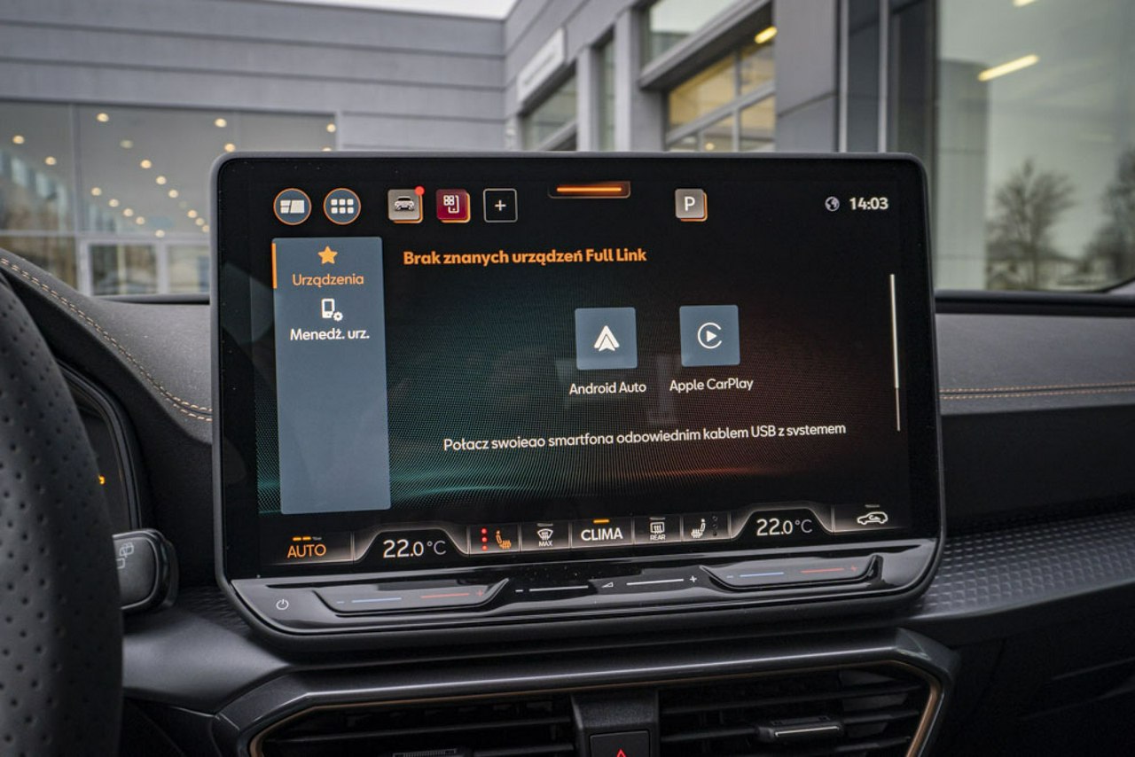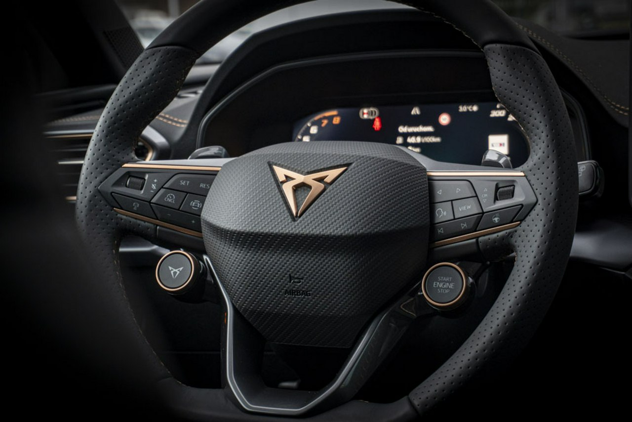• Sportowa, podgrzewana kierownica wielofunkcyjna z łopatkami obszyta skórą z przyciskiem trybu Cupra i przyciskiem uruchamiania silnika