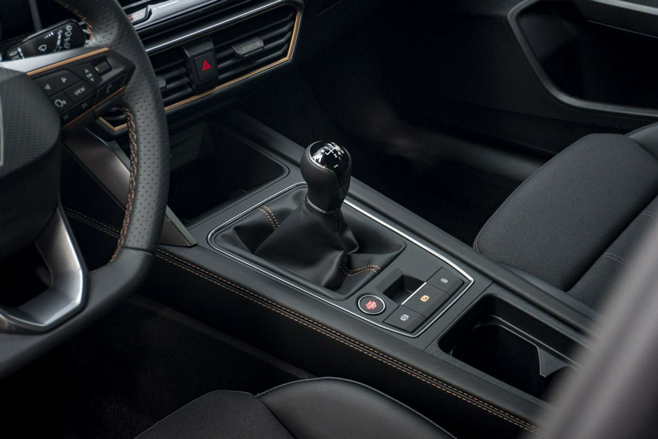 • Sportowa, podgrzewana kierownica wielofunkcyjna z łopatkami obszyta skórą z przyciskiem trybu Cupra i przyciskiem uruchamiania silnika