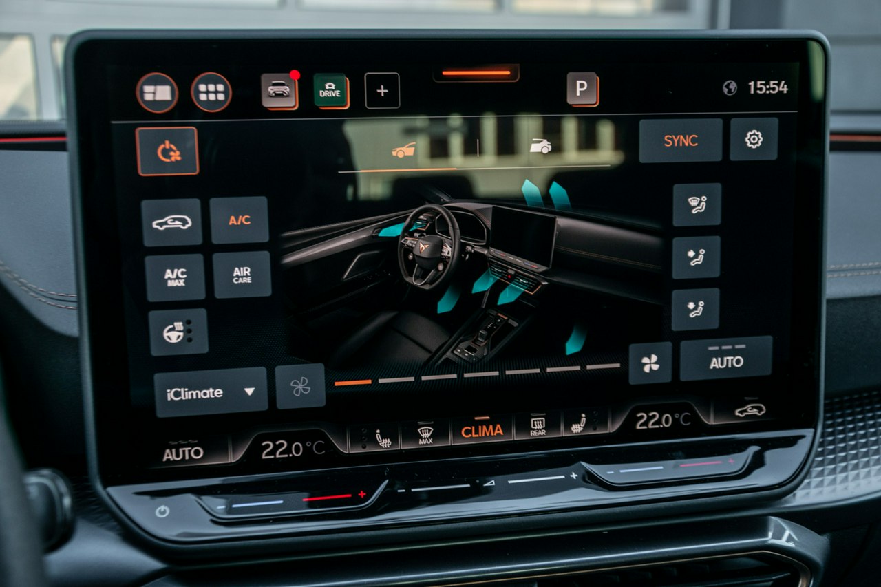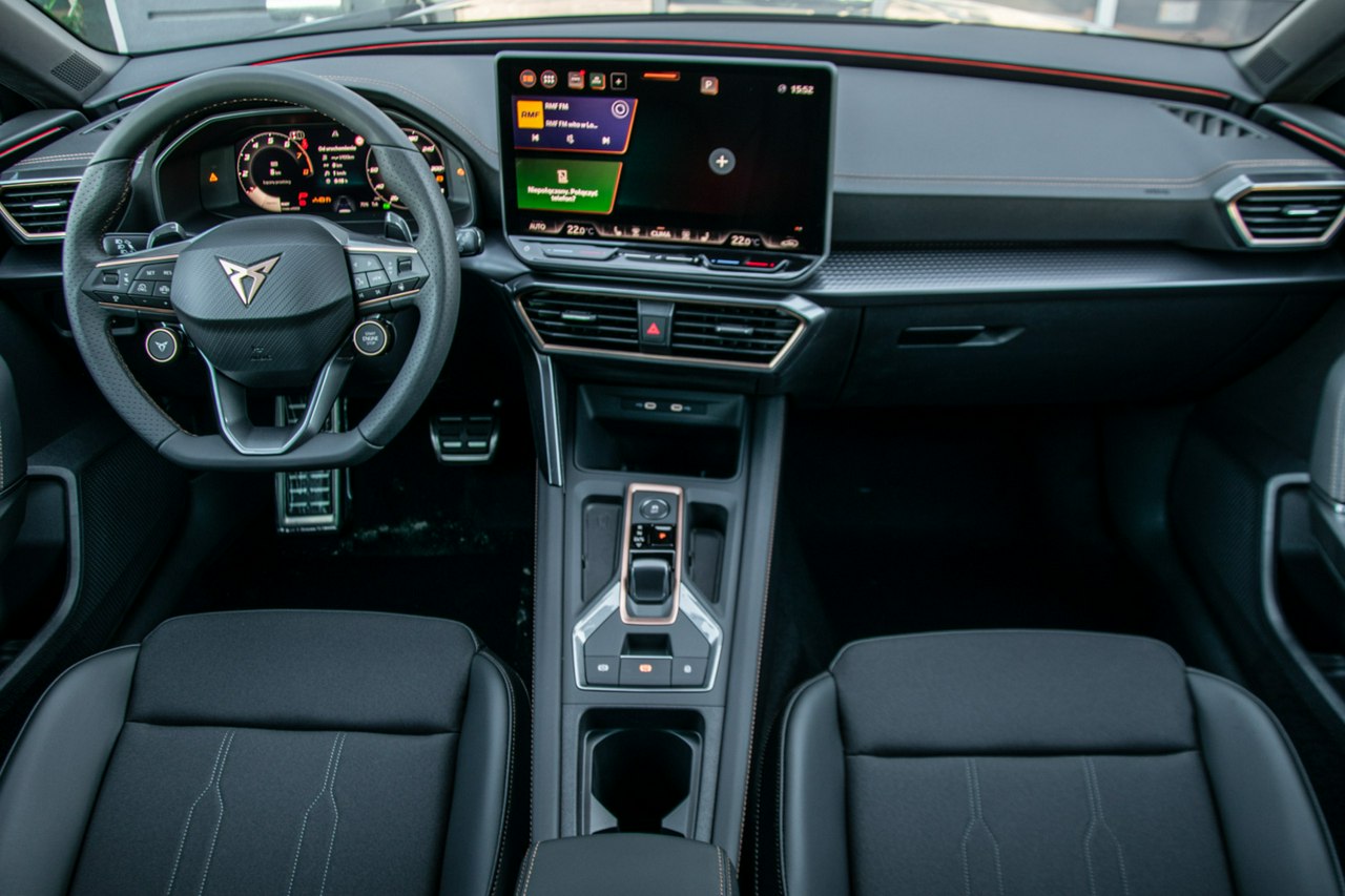 • Sportowa, podgrzewana kierownica wielofunkcyjna z łopatkami obszyta skórą z przyciskiem trybu Cupra i przyciskiem uruchamiania silnika
