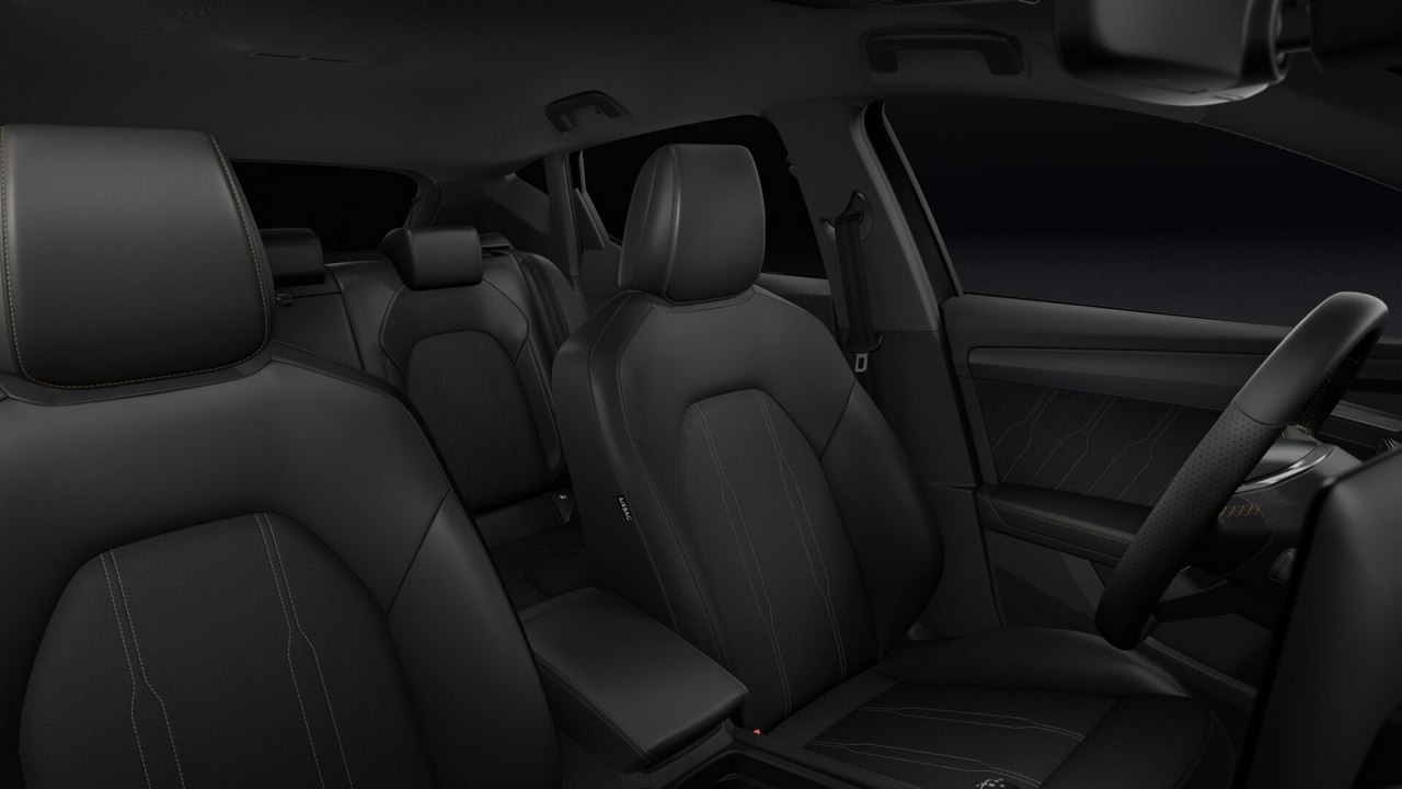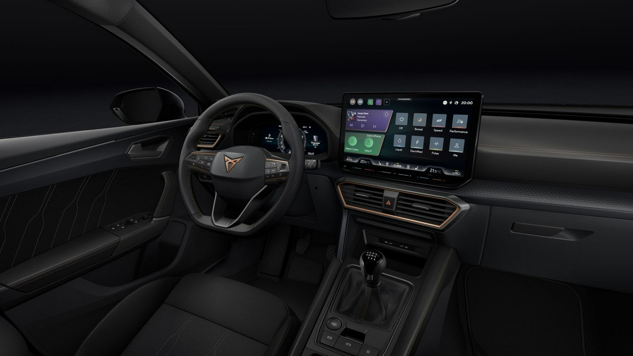 • Sportowa, podgrzewana kierownica wielofunkcyjna z łopatkami obszyta skórą z przyciskiem trybu Cupra i przyciskiem uruchamiania silnika