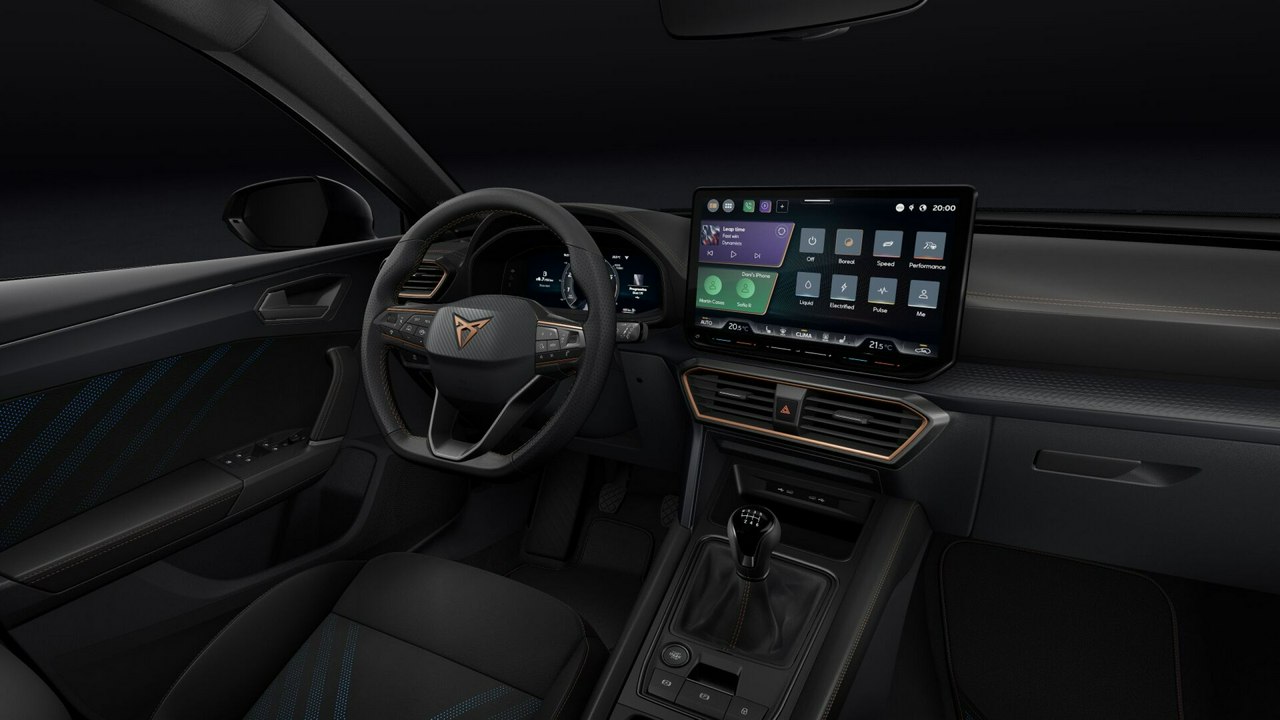 • Sportowa, podgrzewana kierownica wielofunkcyjna z łopatkami obszyta skórą z przyciskiem trybu Cupra i przyciskiem uruchamiania silnika