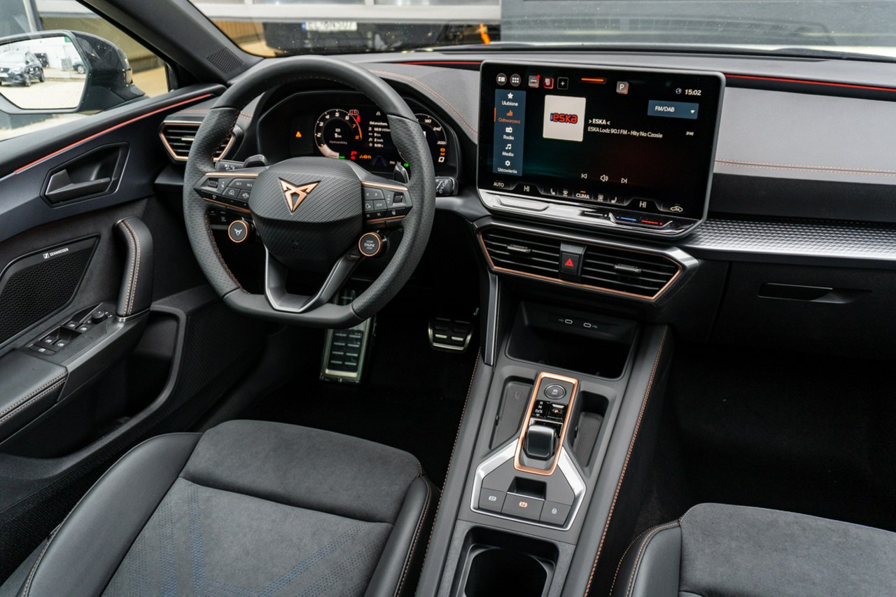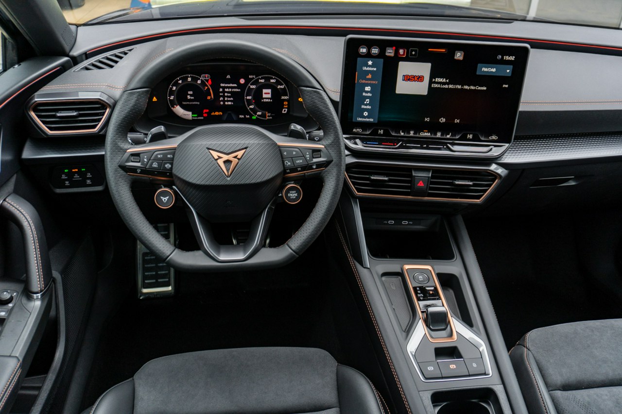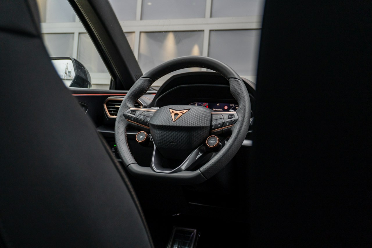 • Sportowa, podgrzewana kierownica wielofunkcyjna z łopatkami obszyta skórą z przyciskiem trybu Cupra i przyciskiem uruchamiania silnika