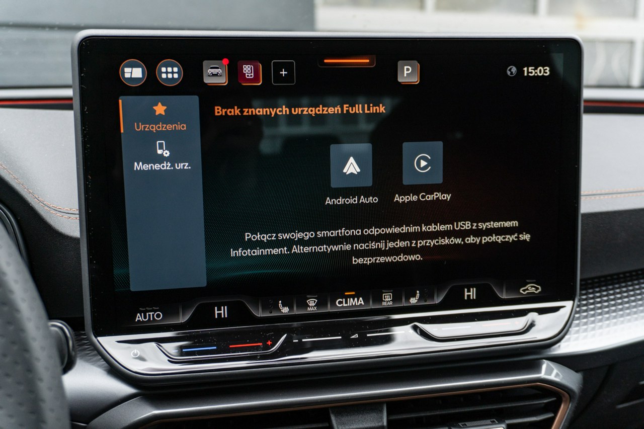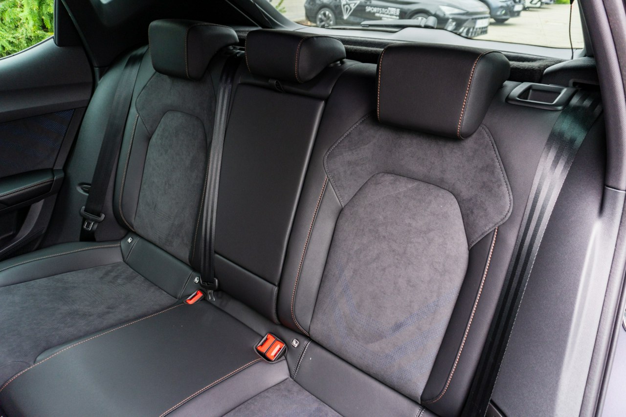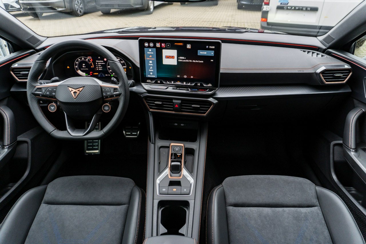 • Sportowa, podgrzewana kierownica wielofunkcyjna z łopatkami obszyta skórą z przyciskiem trybu Cupra i przyciskiem uruchamiania silnika