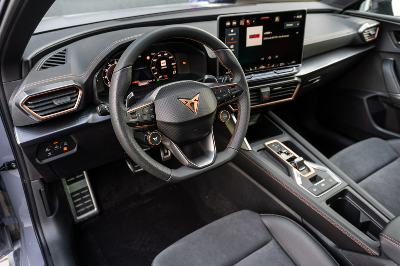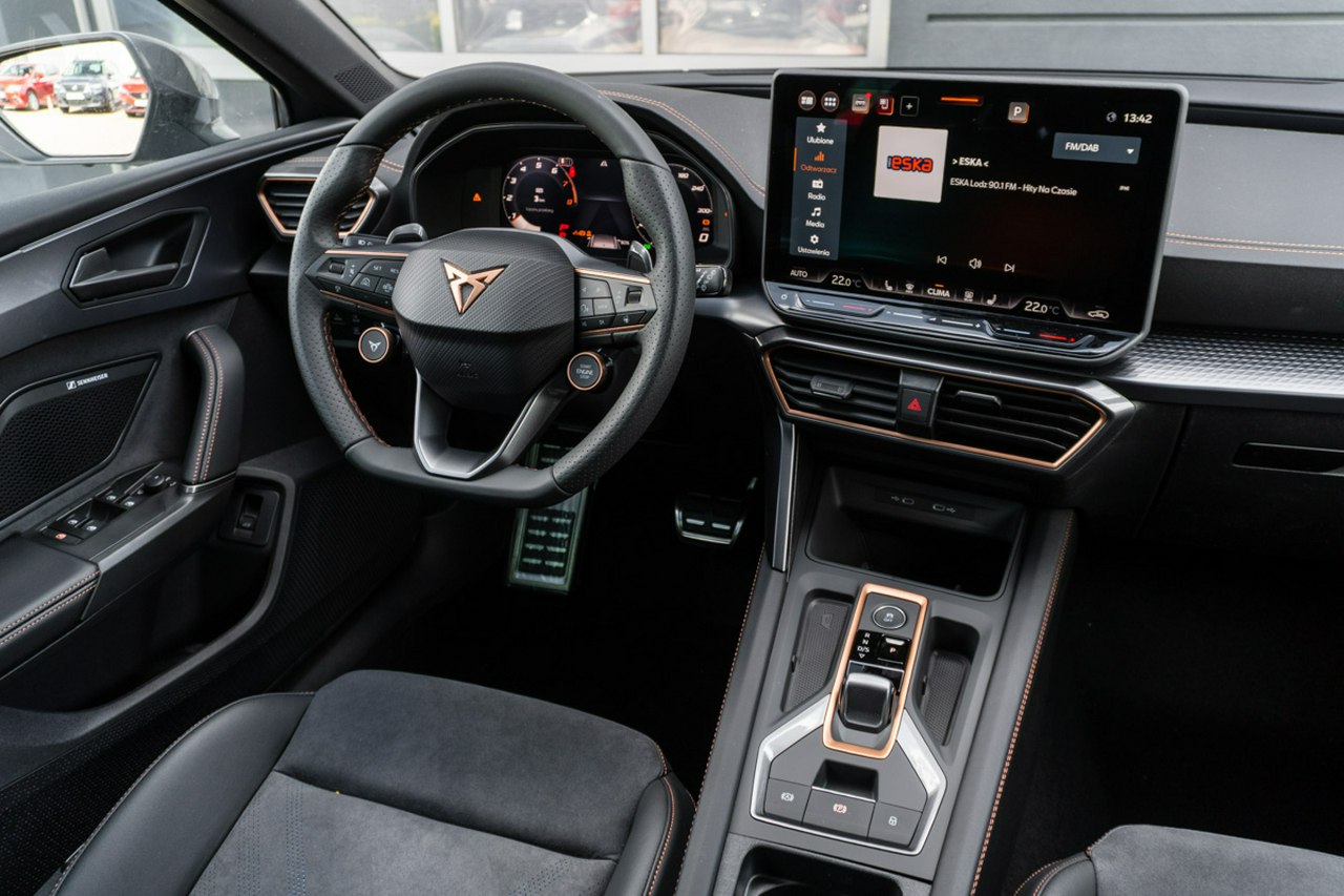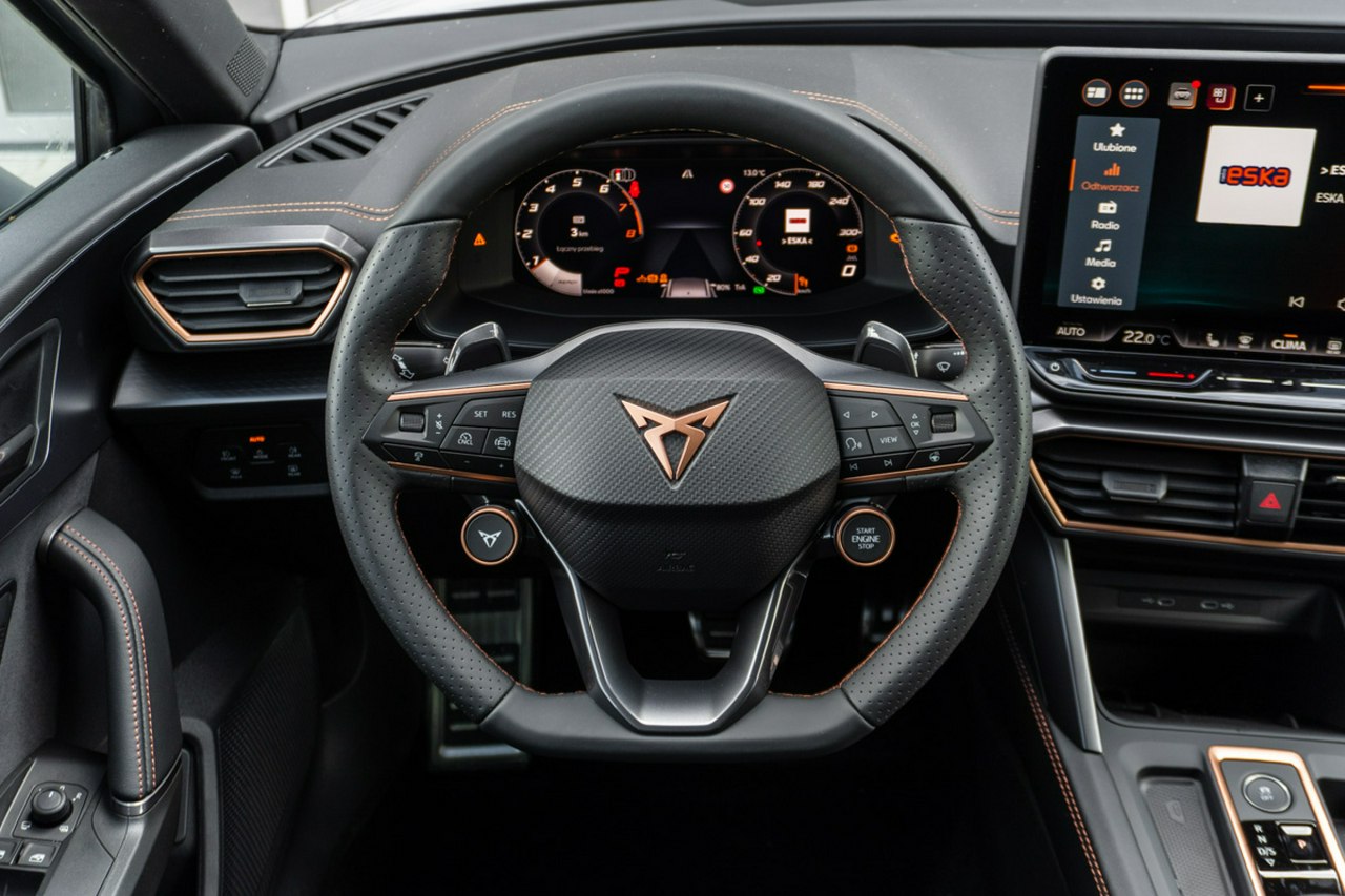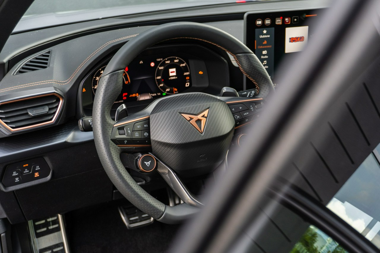 • Sportowa, podgrzewana kierownica wielofunkcyjna z łopatkami obszyta skórą z przyciskiem trybu Cupra i przyciskiem uruchamiania silnika