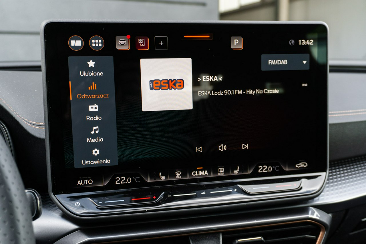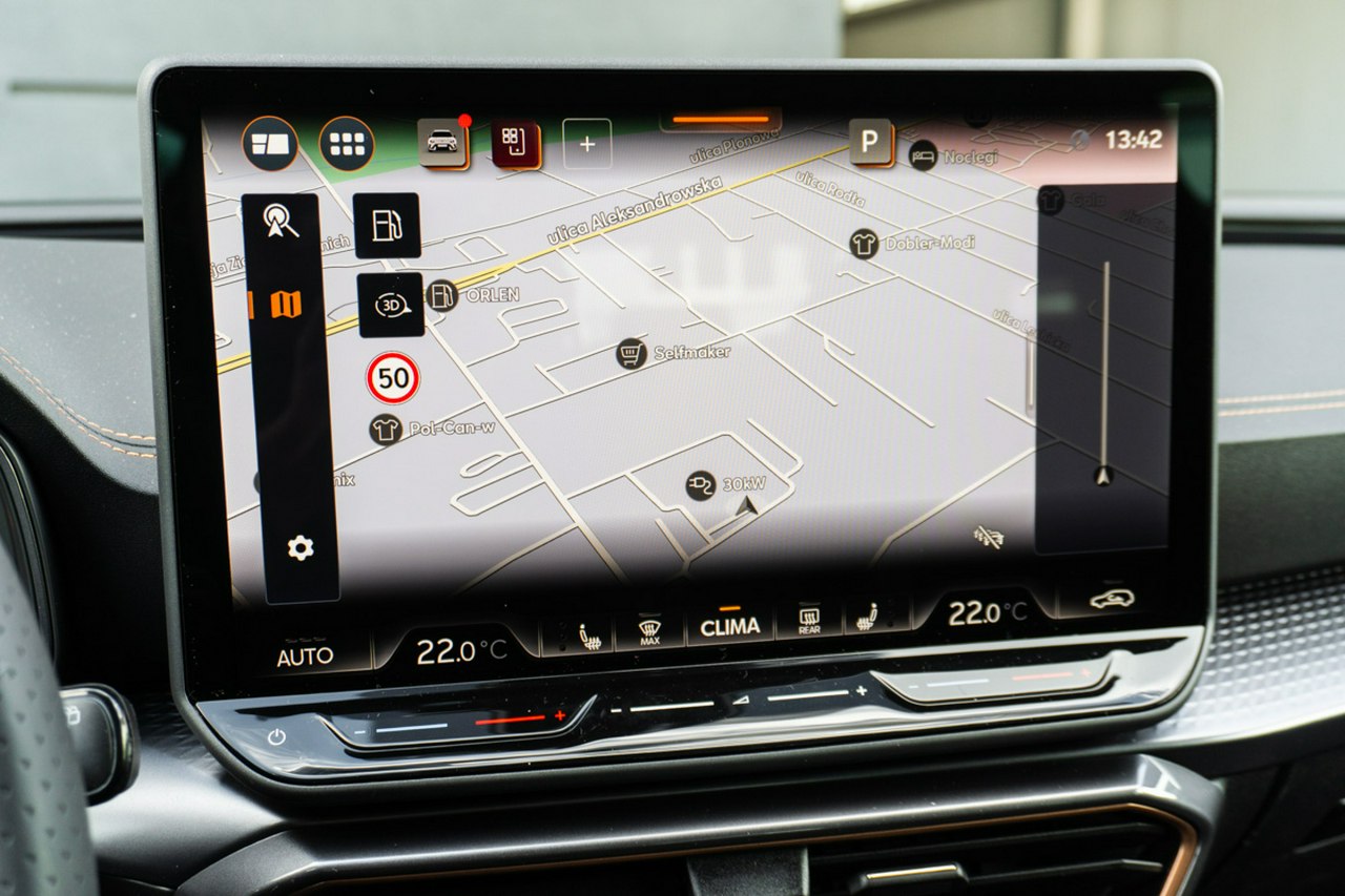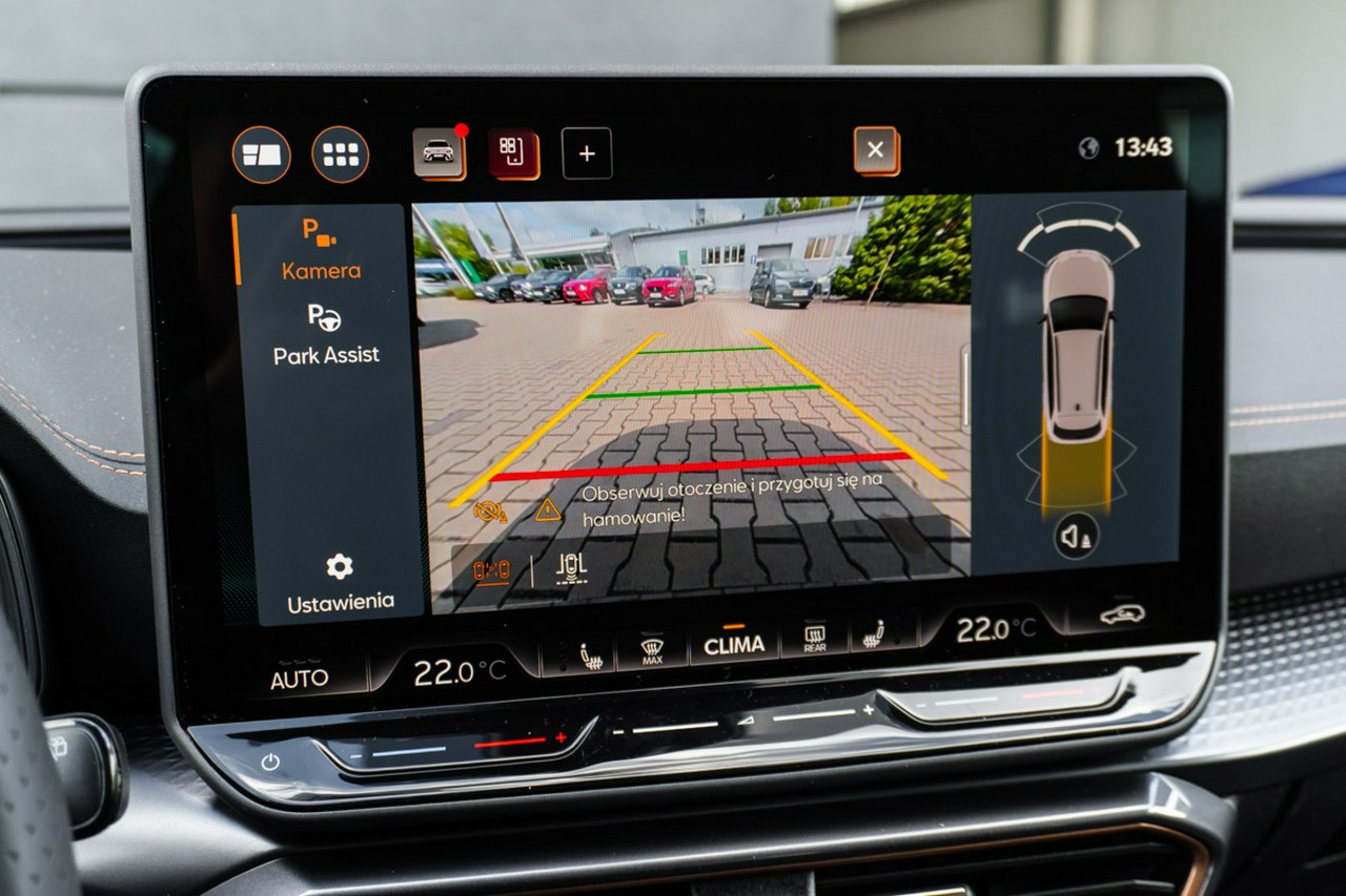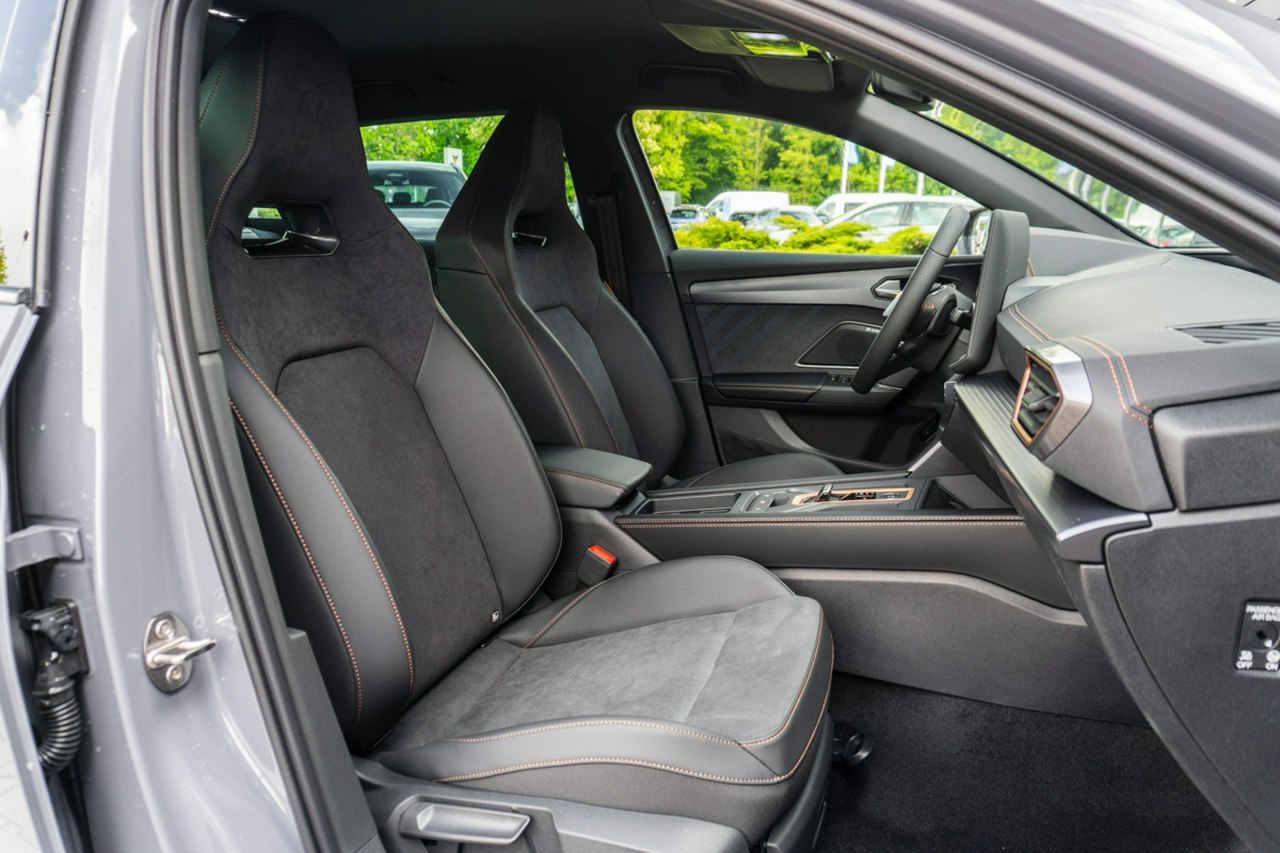 • Sportowa, podgrzewana kierownica wielofunkcyjna z łopatkami obszyta skórą z przyciskiem trybu Cupra i przyciskiem uruchamiania silnika