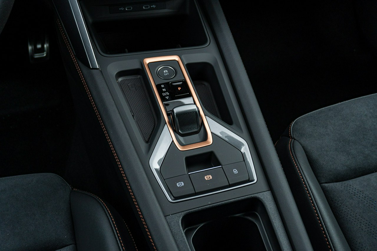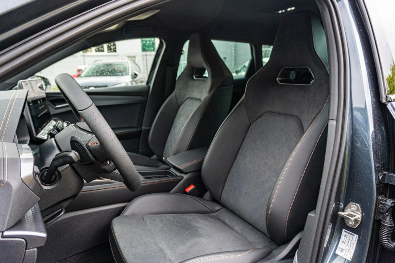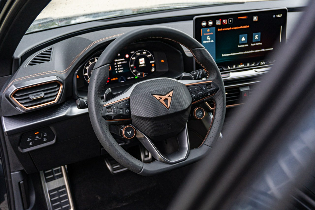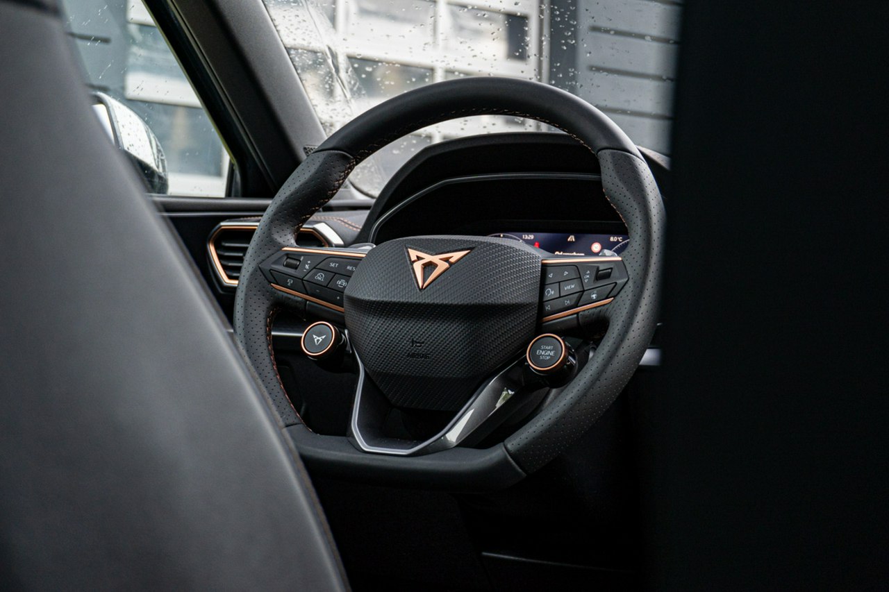 • Sportowa, podgrzewana kierownica wielofunkcyjna z łopatkami obszyta skórą z przyciskiem trybu Cupra i przyciskiem uruchamiania silnika