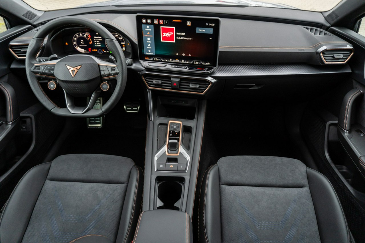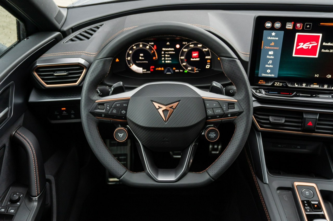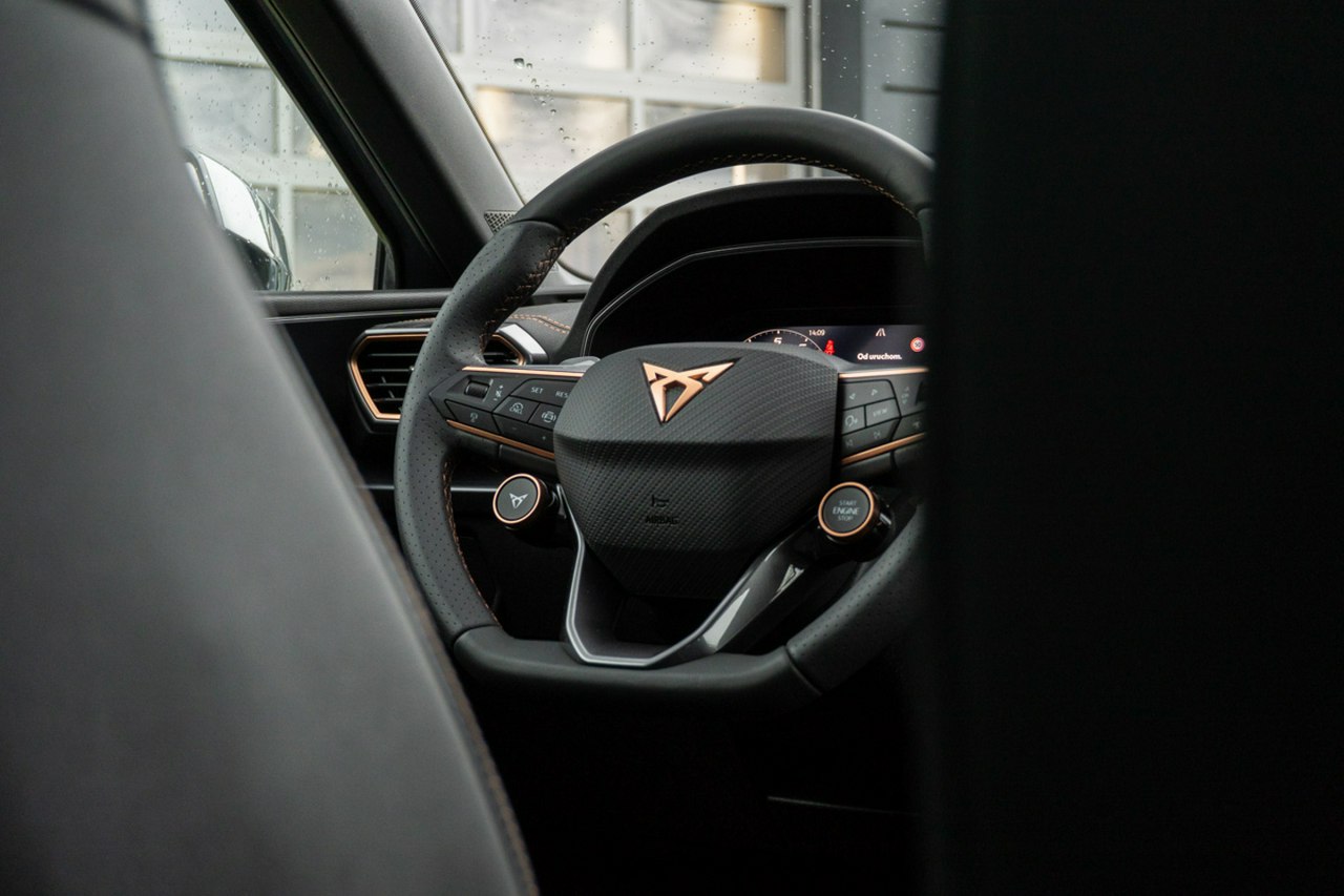 • Sportowa, podgrzewana kierownica wielofunkcyjna z łopatkami obszyta skórą z przyciskiem trybu Cupra i przyciskiem uruchamiania silnika