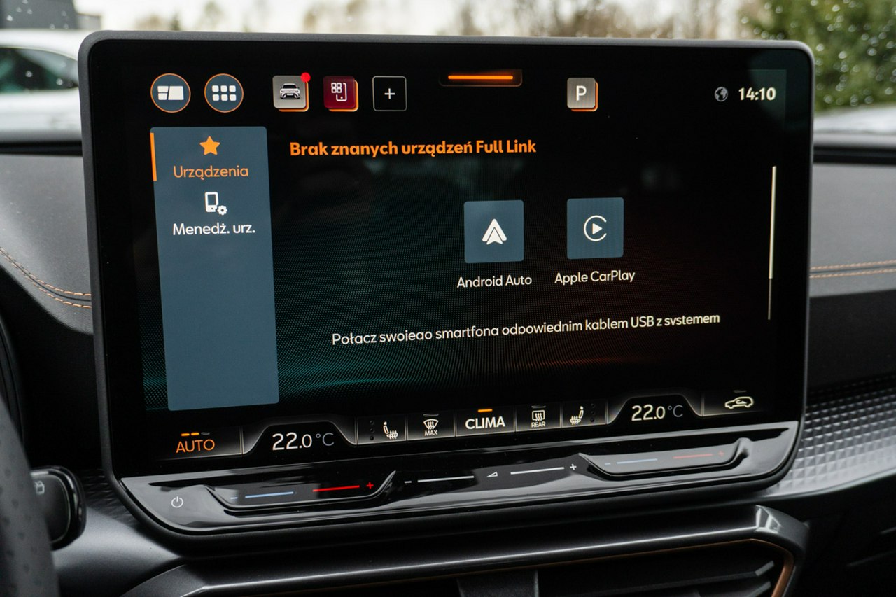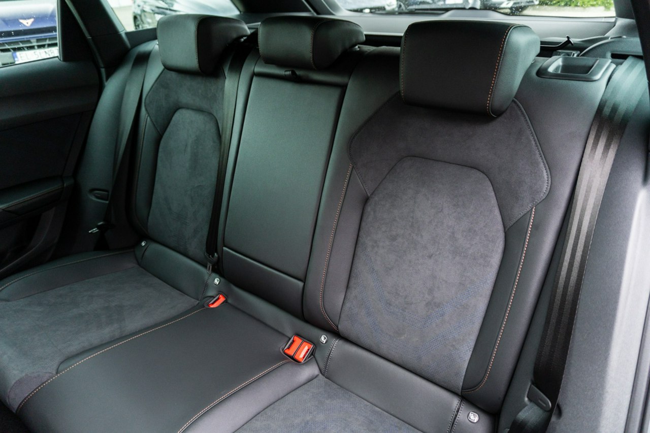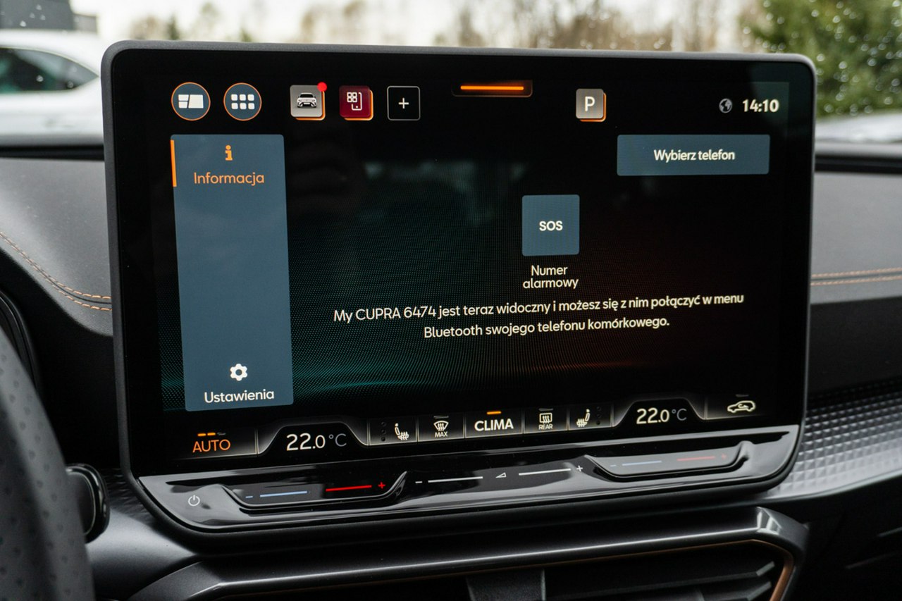 • Sportowa, podgrzewana kierownica wielofunkcyjna z łopatkami obszyta skórą z przyciskiem trybu Cupra i przyciskiem uruchamiania silnika