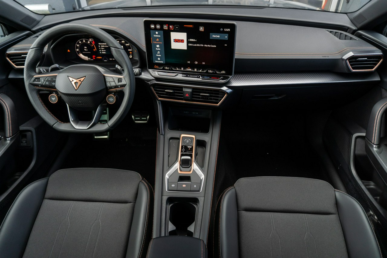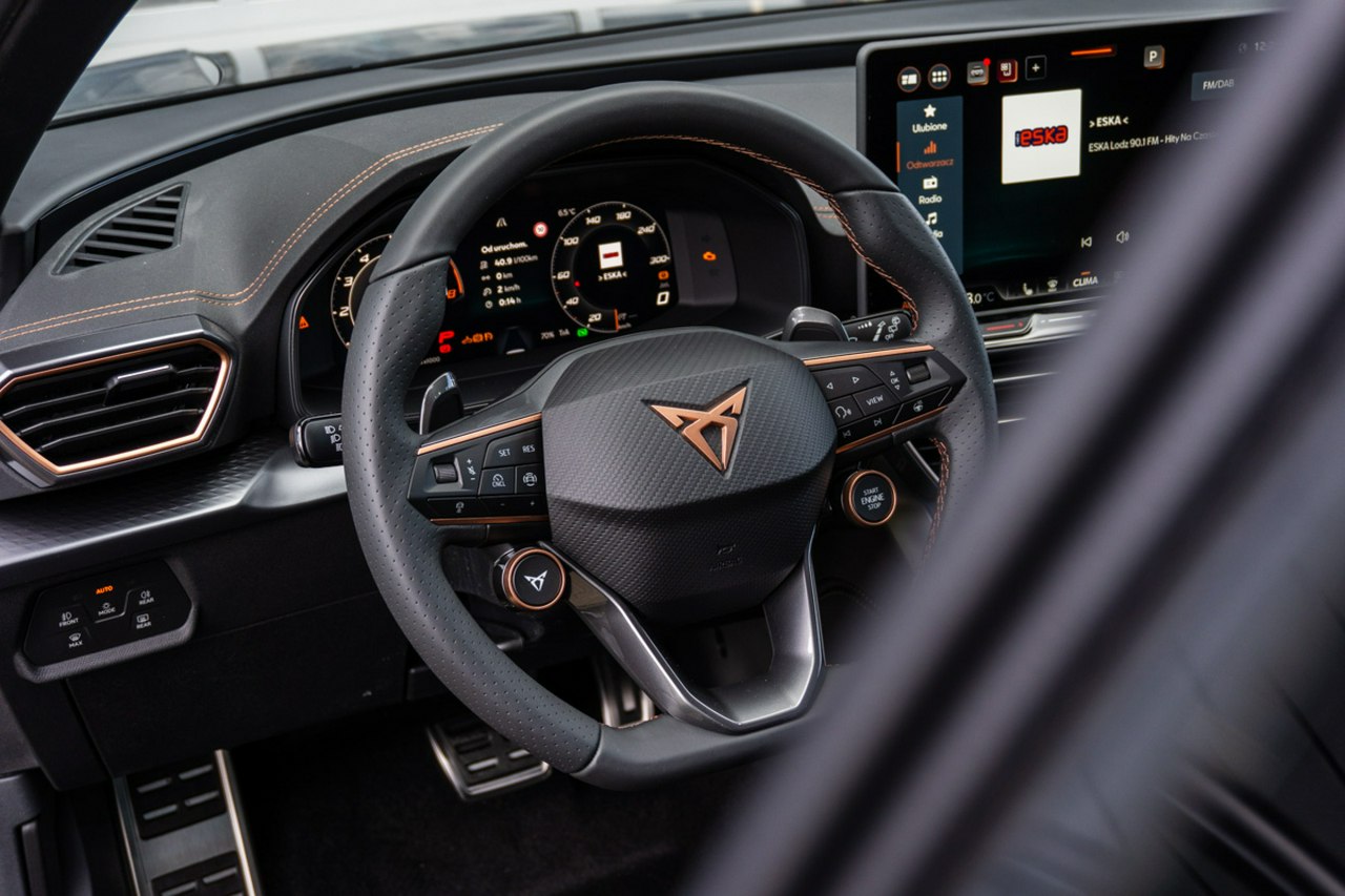 • Sportowa, podgrzewana kierownica wielofunkcyjna z łopatkami obszyta skórą z przyciskiem trybu Cupra i przyciskiem uruchamiania silnika