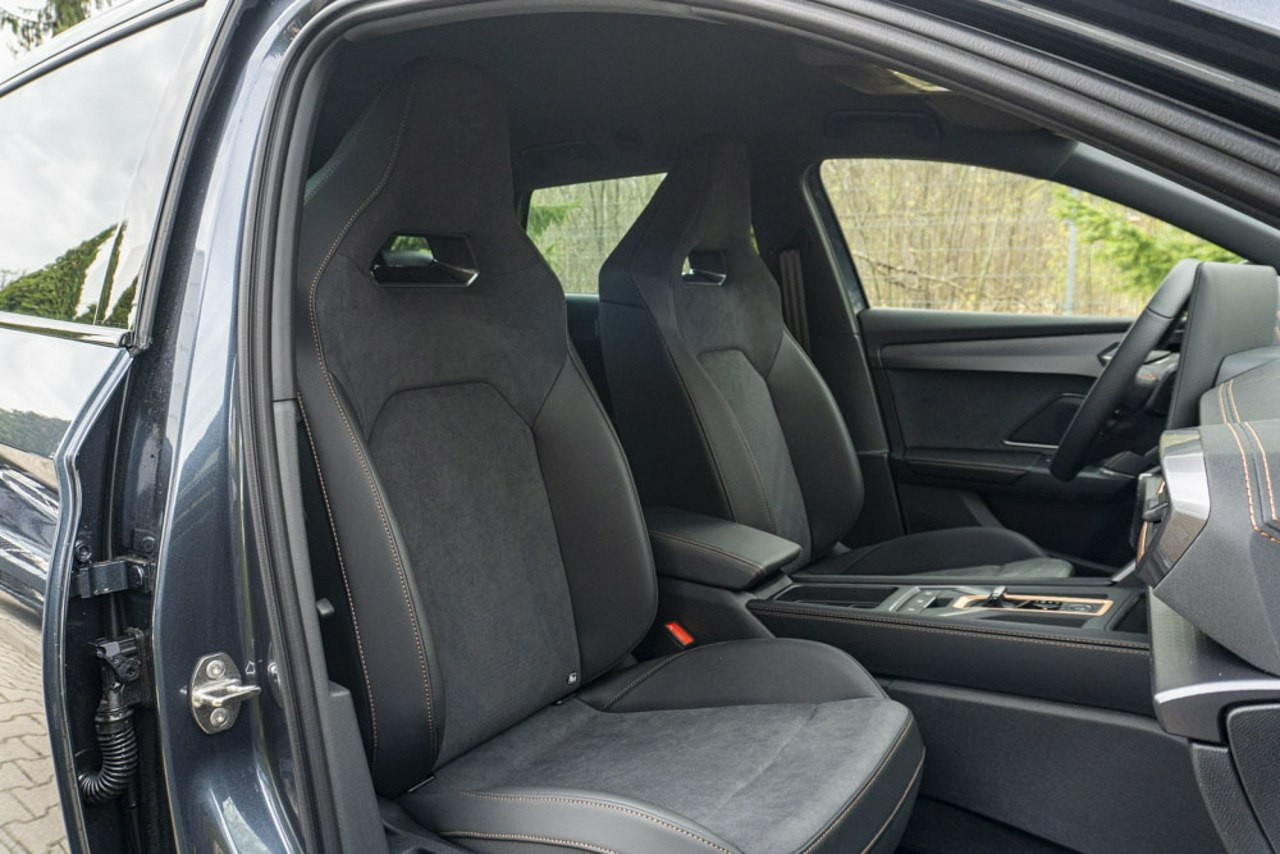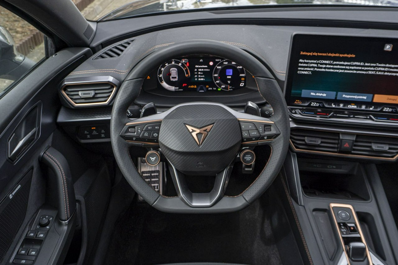 • Sportowa, podgrzewana kierownica wielofunkcyjna z łopatkami obszyta skórą z przyciskiem trybu Cupra i przyciskiem uruchamiania silnika