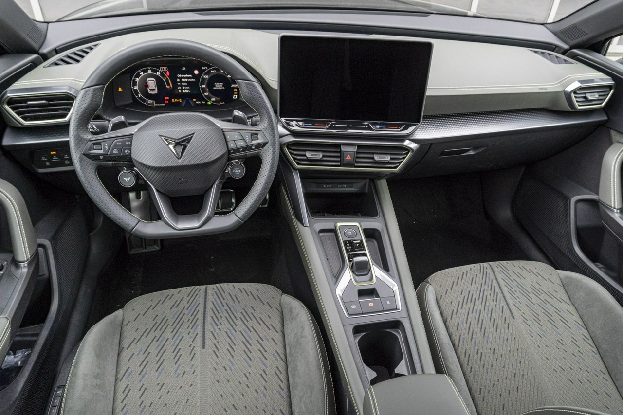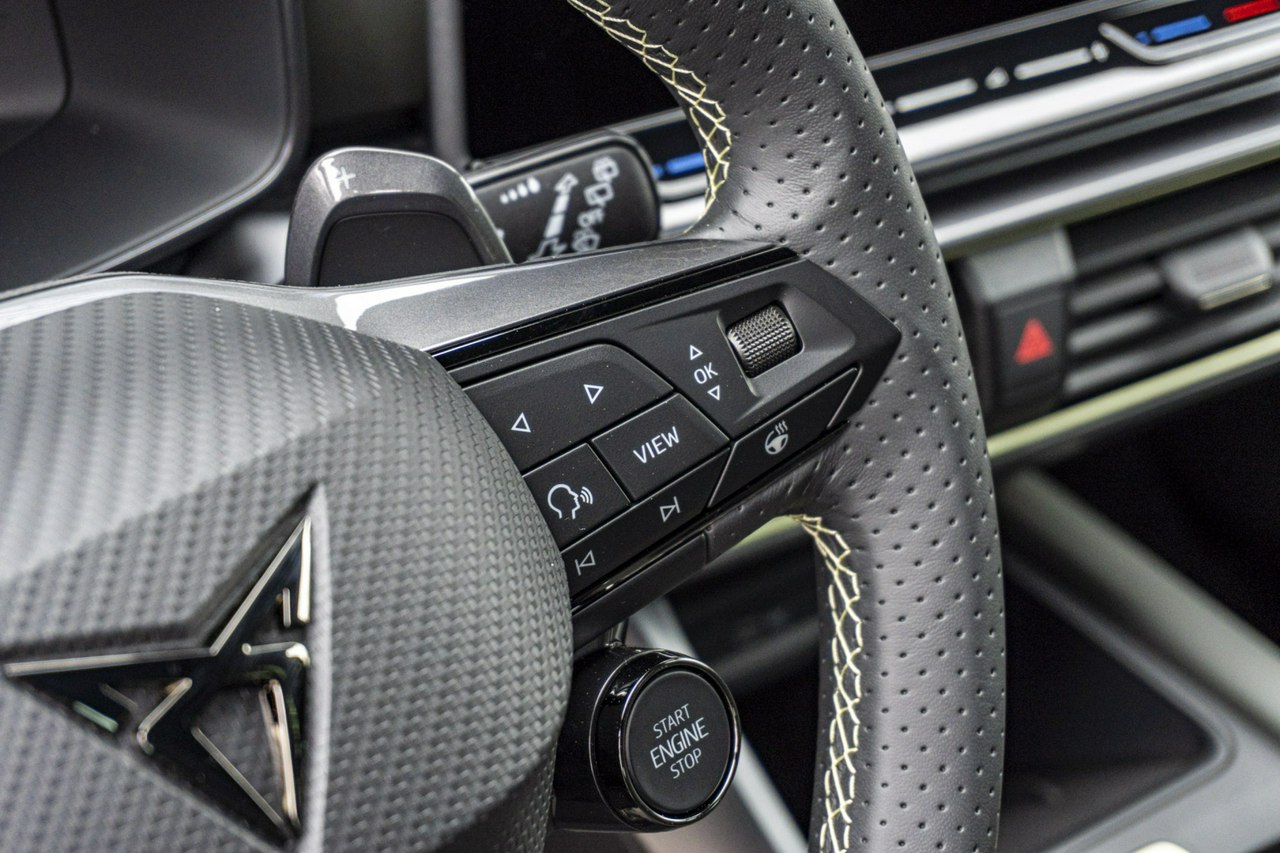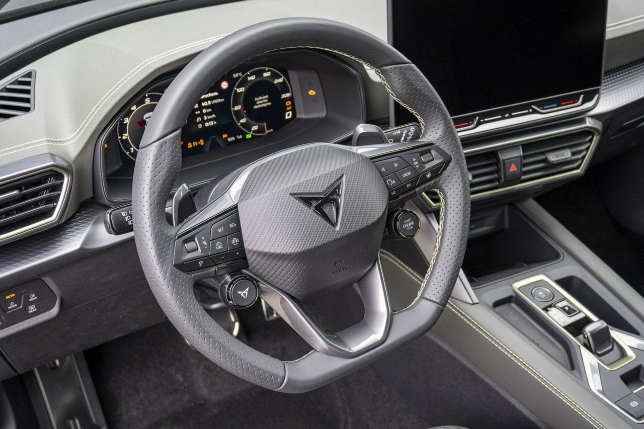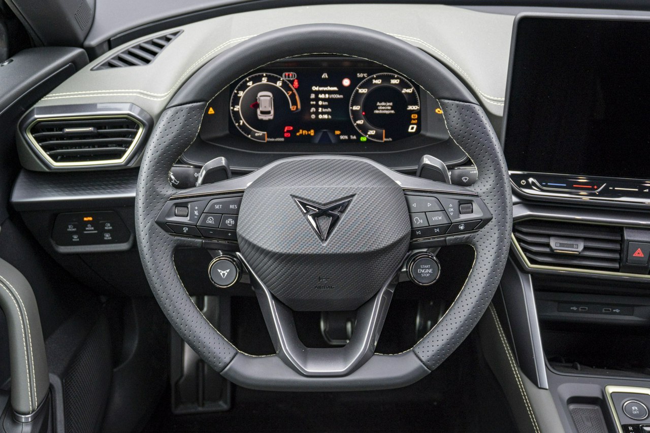 • Sportowa, podgrzewana kierownica wielofunkcyjna z łopatkami obszyta skórą z przyciskiem trybu Cupra i przyciskiem uruchamiania silnika
