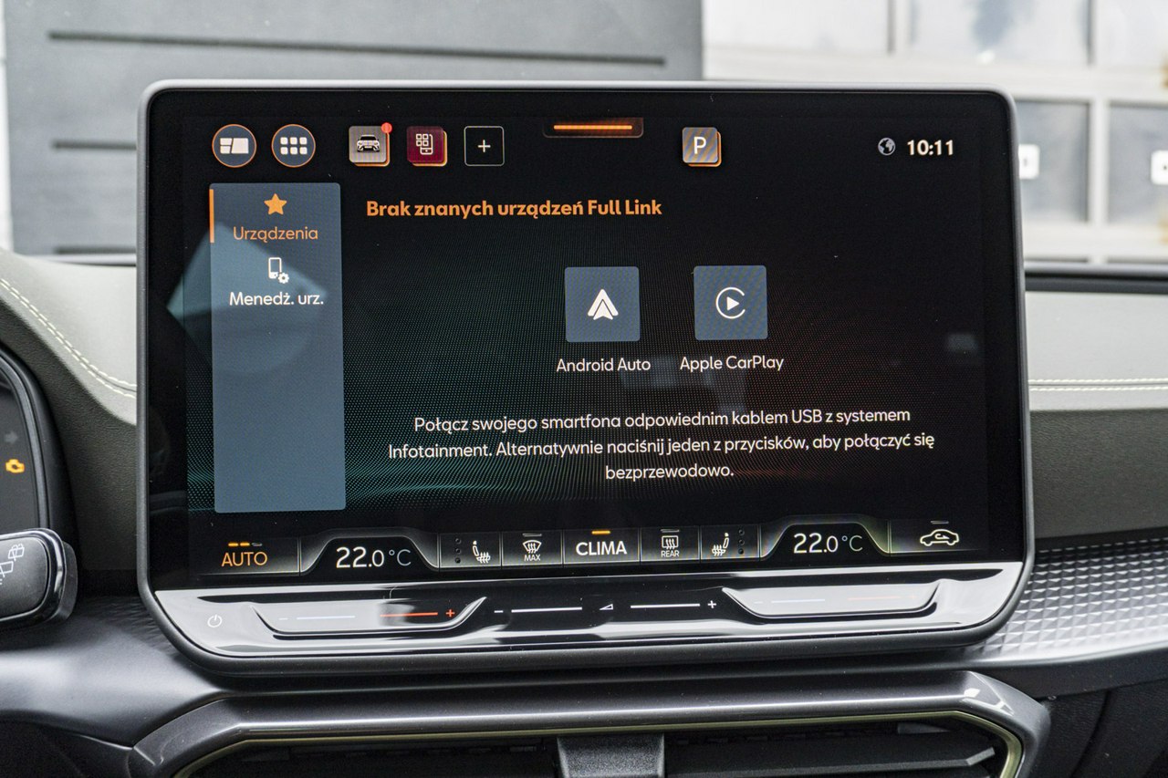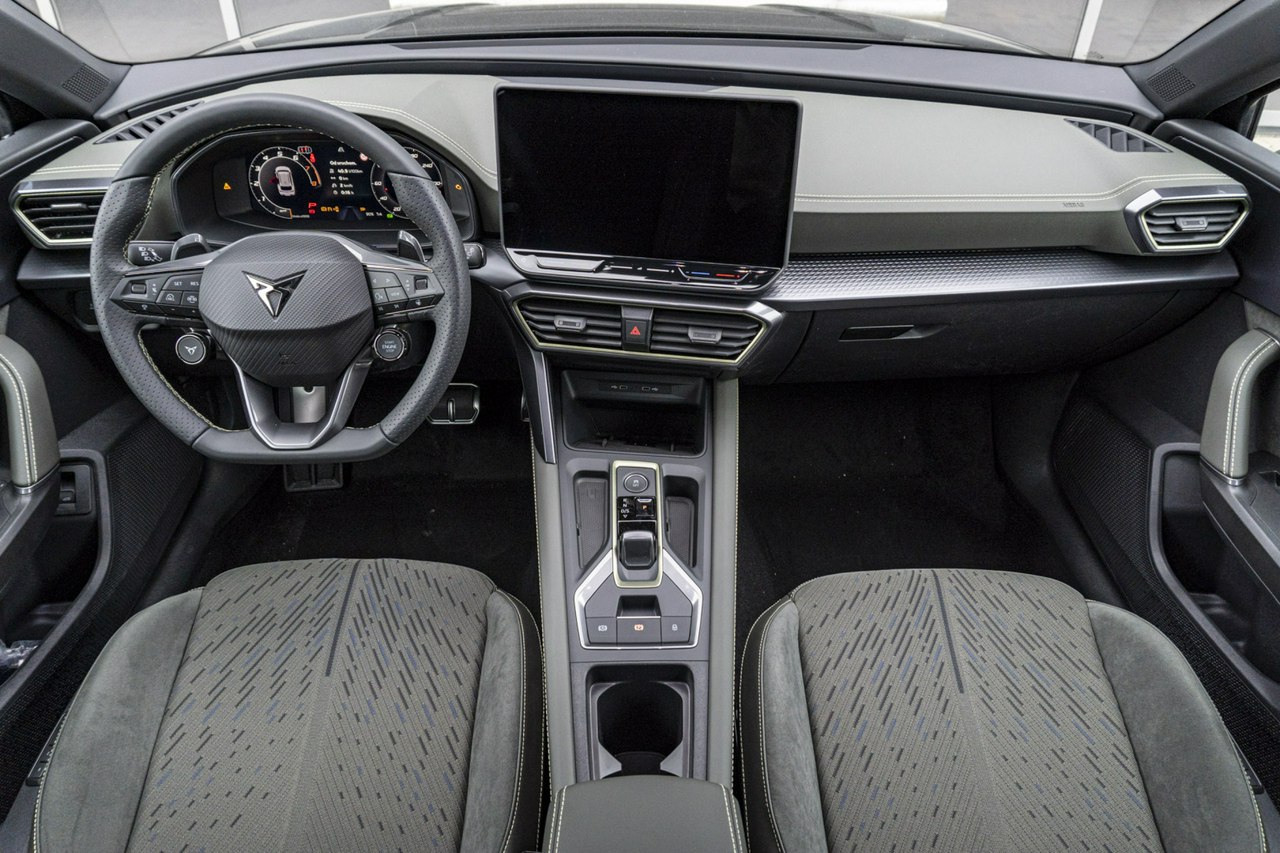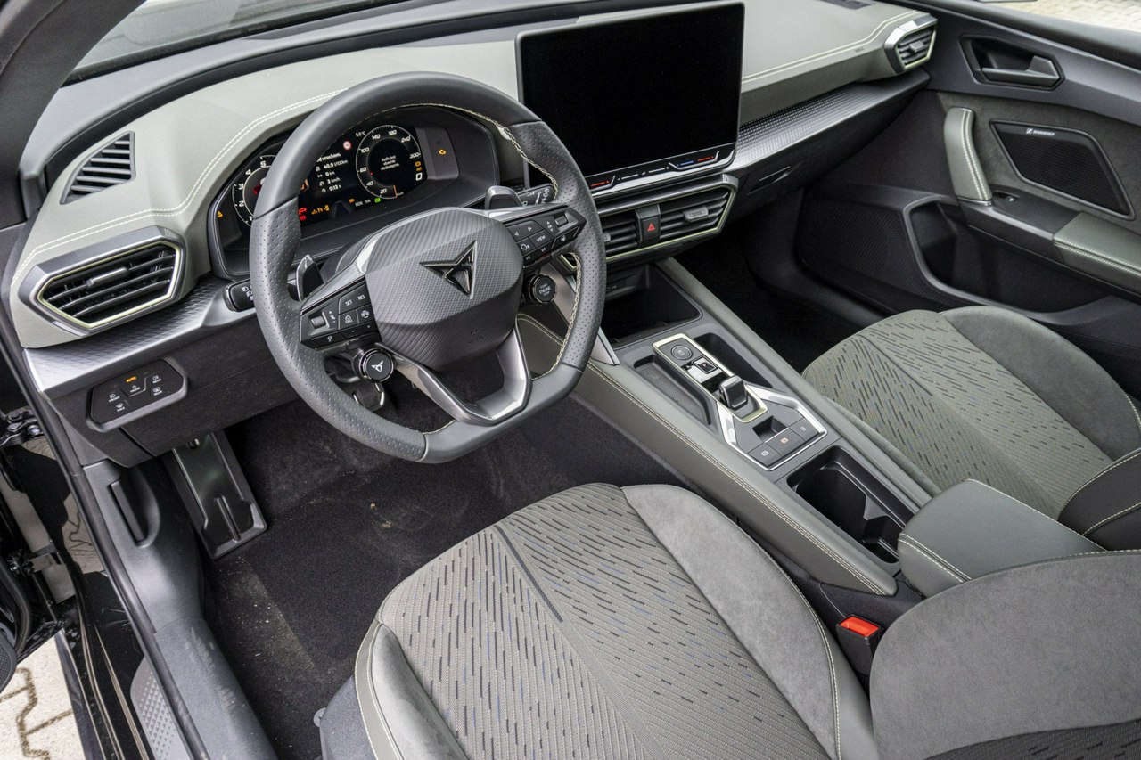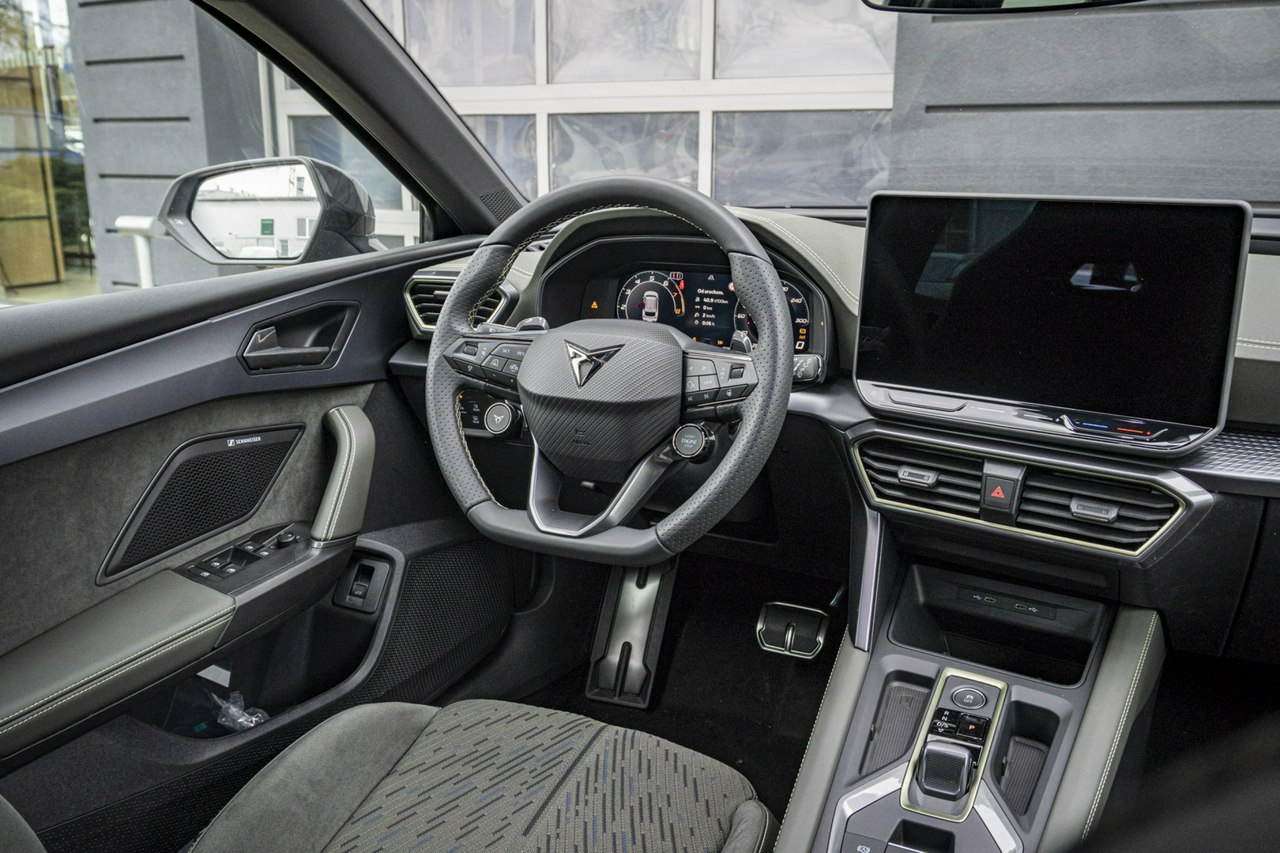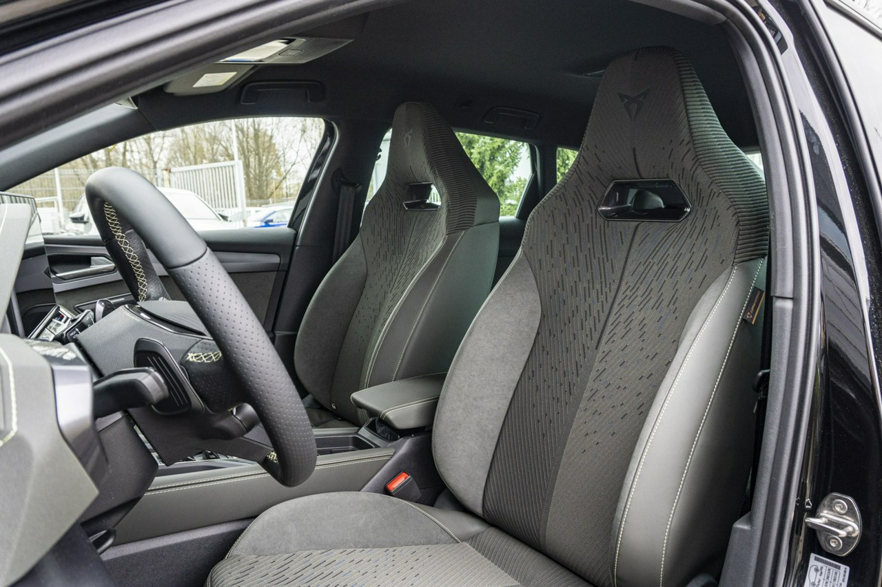 • Sportowa, podgrzewana kierownica wielofunkcyjna z łopatkami obszyta skórą z przyciskiem trybu Cupra i przyciskiem uruchamiania silnika