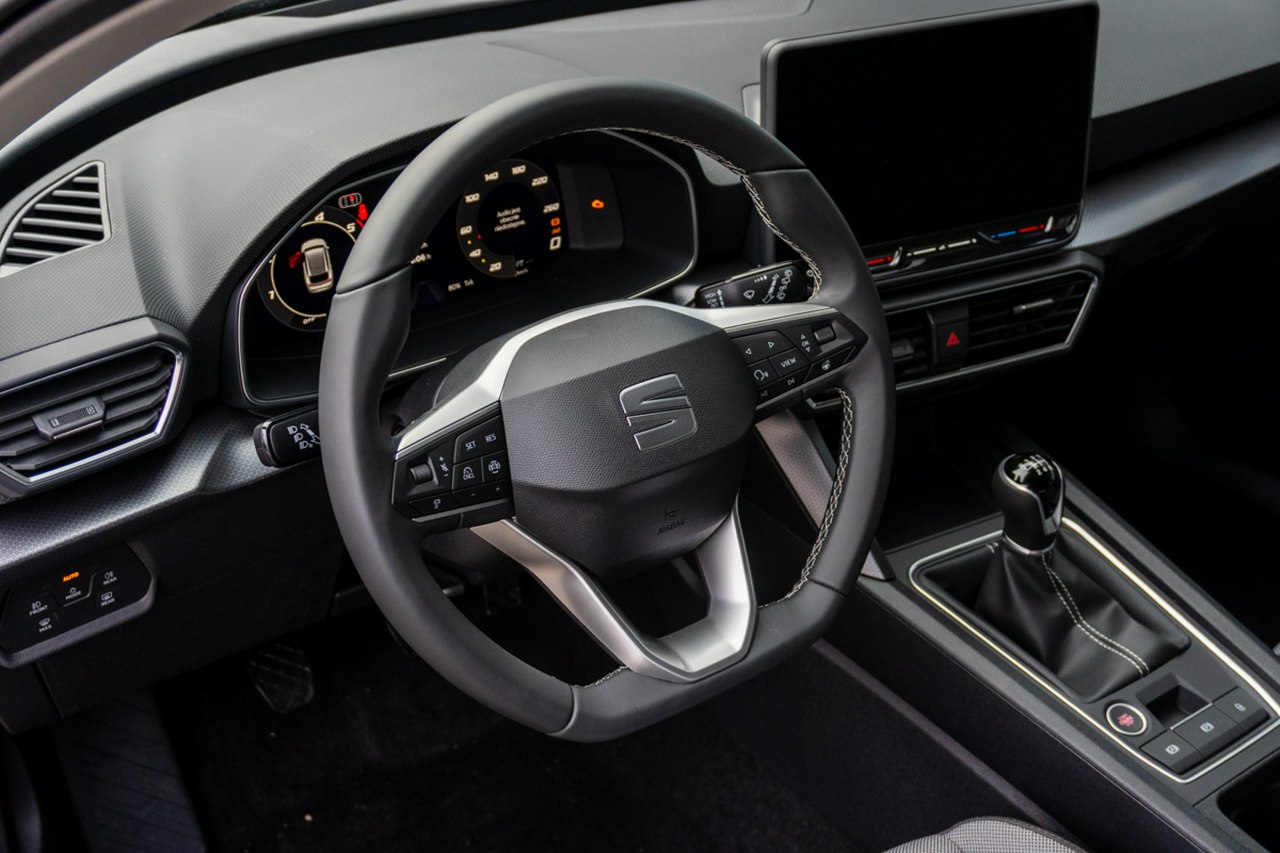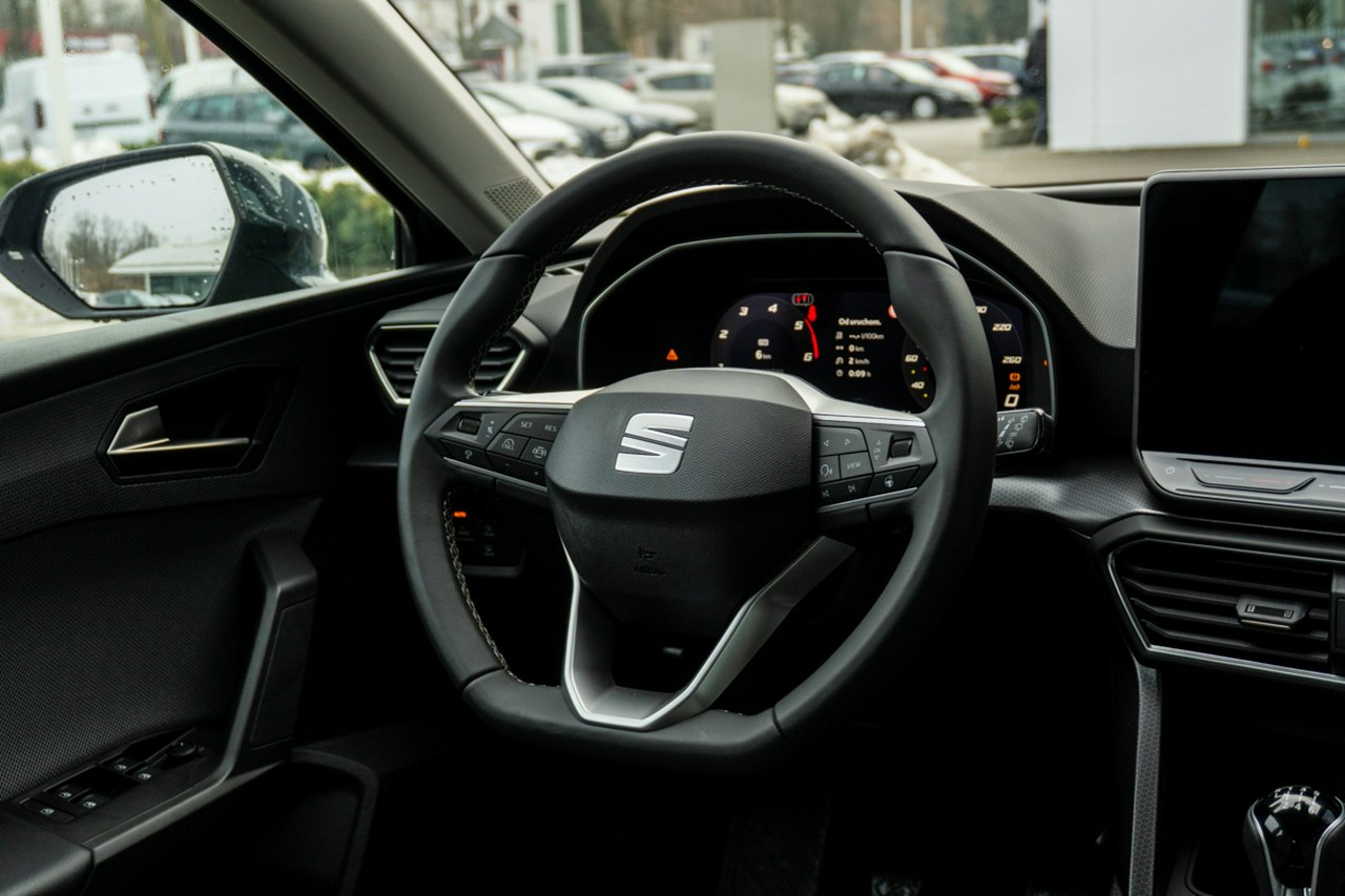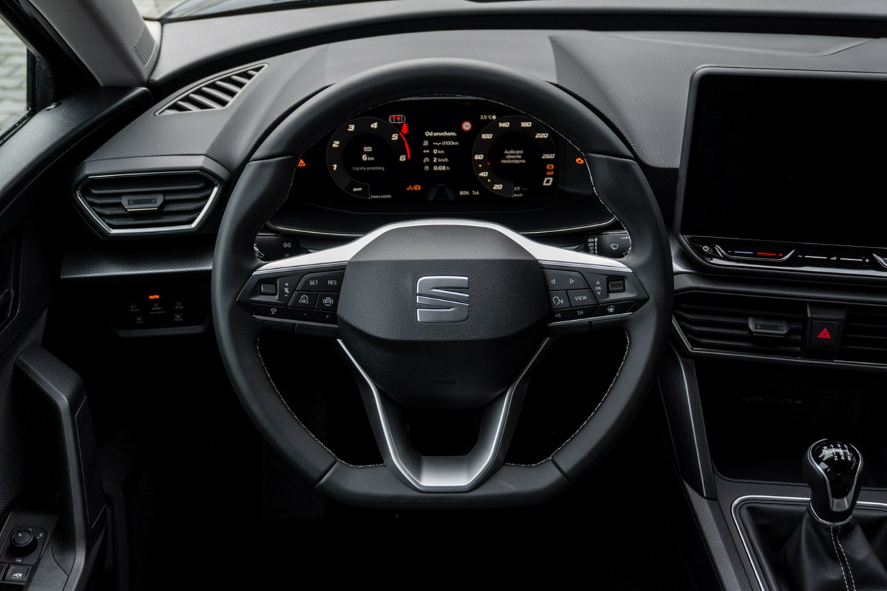• Sportowa kierownica wielofunkcyjna obszyta skórą z białym przeszyciem