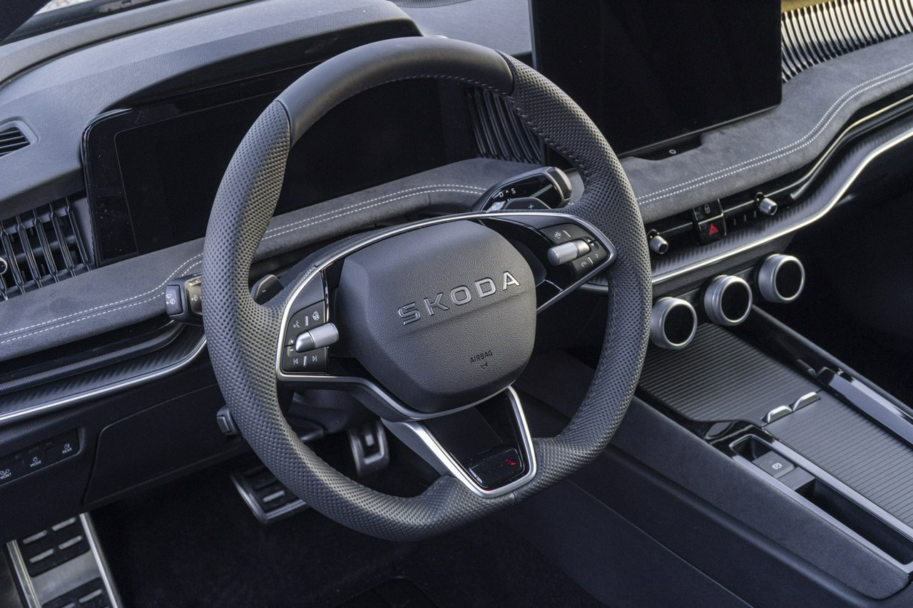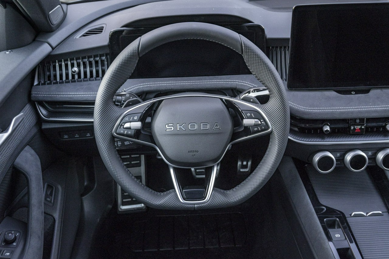 • Sportowa, perforowana, skórzana trójramienna wielofunkcyjna kierownica z manetkami do zmiany biegów